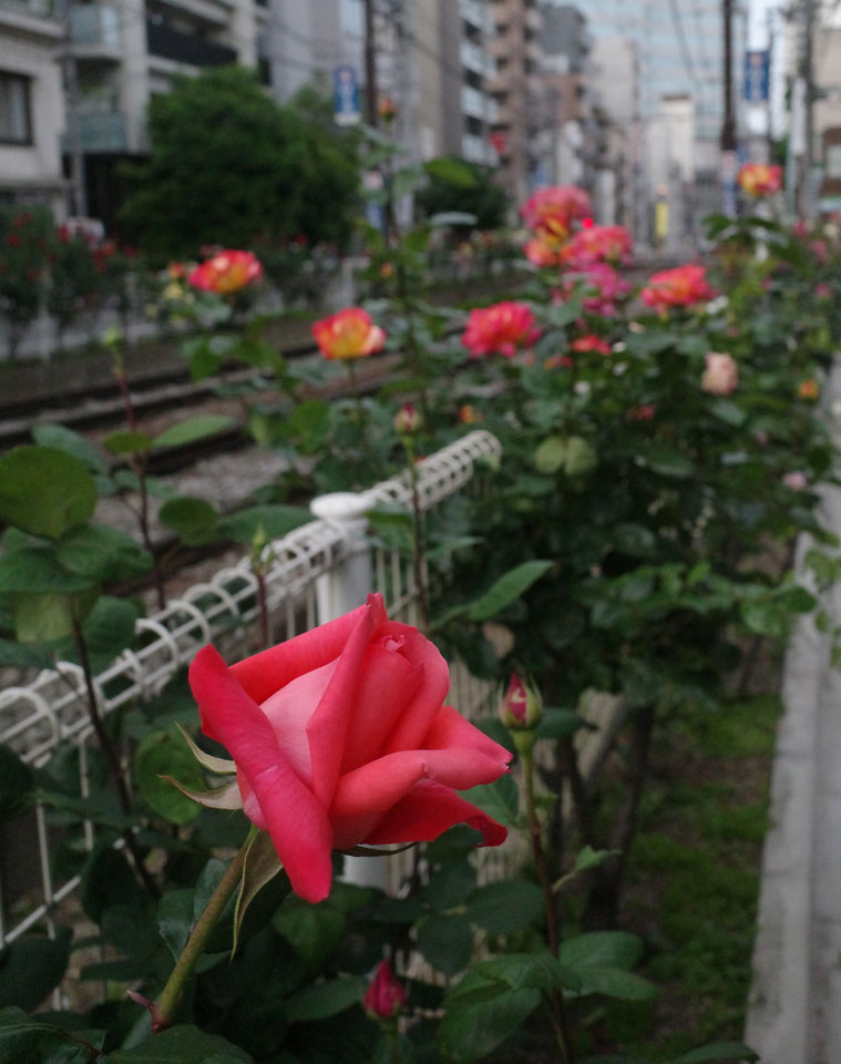 このブログ3月の「大塚の夜道」という記事で大塚駅から早稲田方面へ伸びる都電の線路沿いが「大塚バラロード」となってるのを知ったと書いたのですが、先日通りかかったらまさにバラが見頃でした。