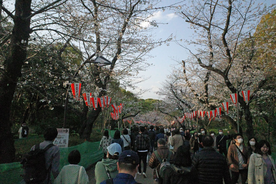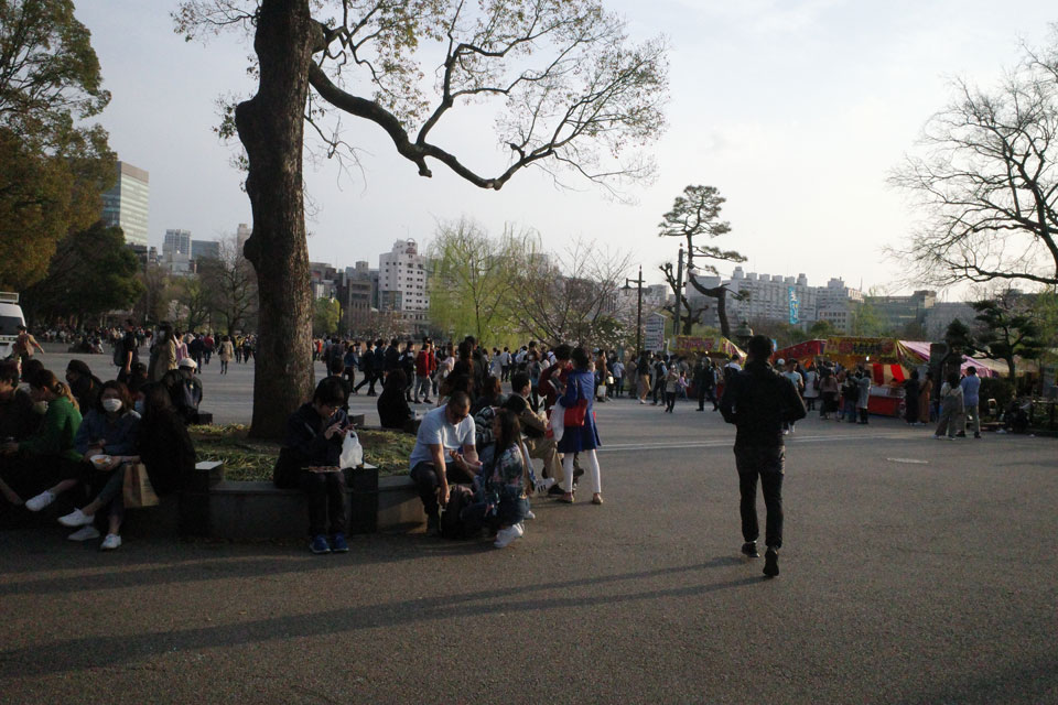 一応道端には宴席禁止の張り紙立て札囲い柵などあり、例年のように集まり居座って騒いでる人こそいないものの。縁石は腰掛けてる人でいっぱいだし。