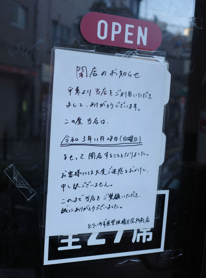 ありゃあ、閉店でしたか。もとはなごみそばというお蕎麦屋さん、更にその前は確かゲーセンだったところ。去年の夏オープンして、なんとかコロナ禍もくぐり抜けられたかと思ってたのに。割に近くに唐揚げ専門店とか豚丼の店だけど唐揚げも出してるとことか立て続けにオープンしたのも影響したのかなあ。とはいえほんの少し先にいつもの板橋の名店鶏肉専門店鳥しんがあるので、唐揚げなどもたいていそこで買ってたりでこの店を利用したことはないまま。一度くらい何か買って見るんだったなあ。まあチェーン店らしいので他で買えはするんですが。