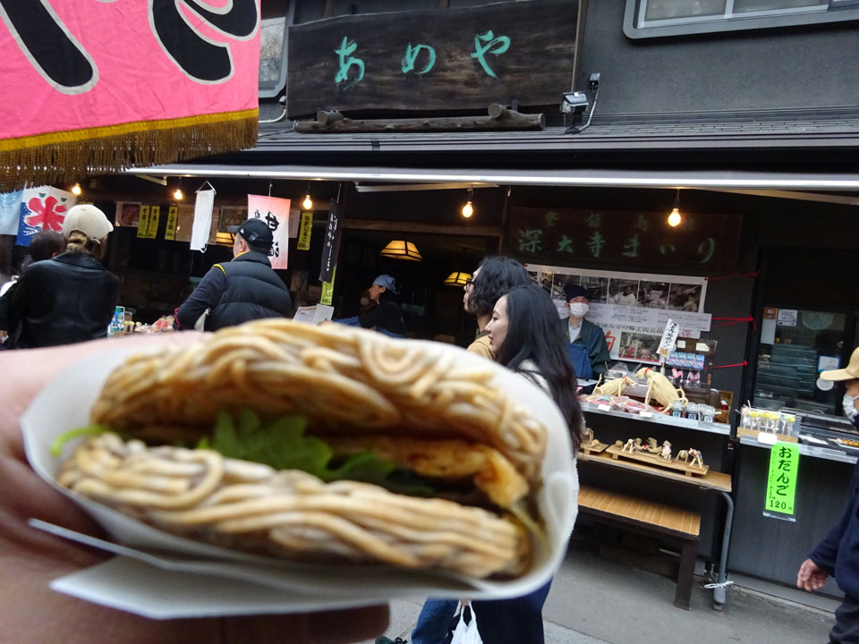 奥の蕎麦屋さんが並ぶあたりでは蕎麦を使ったいろんなものが売られてまして、その一つがこのそばバーガー。パンズに蕎麦を挟んであるのではなく、丸く固めた蕎麦に具を挟んだもの。