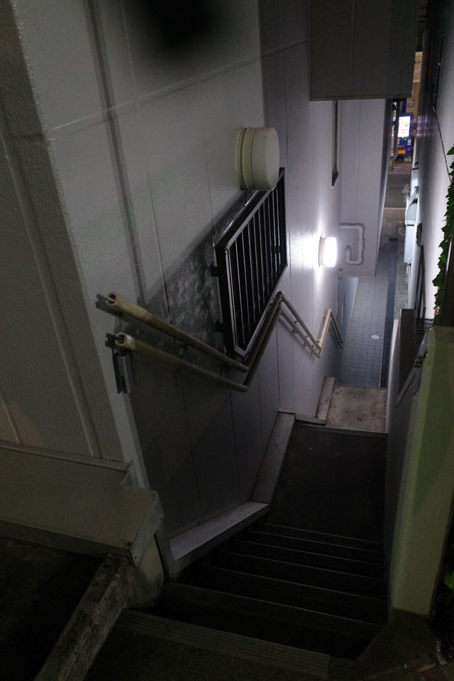 こんな細い隙間の階段を下って奥の方とのことですよ。