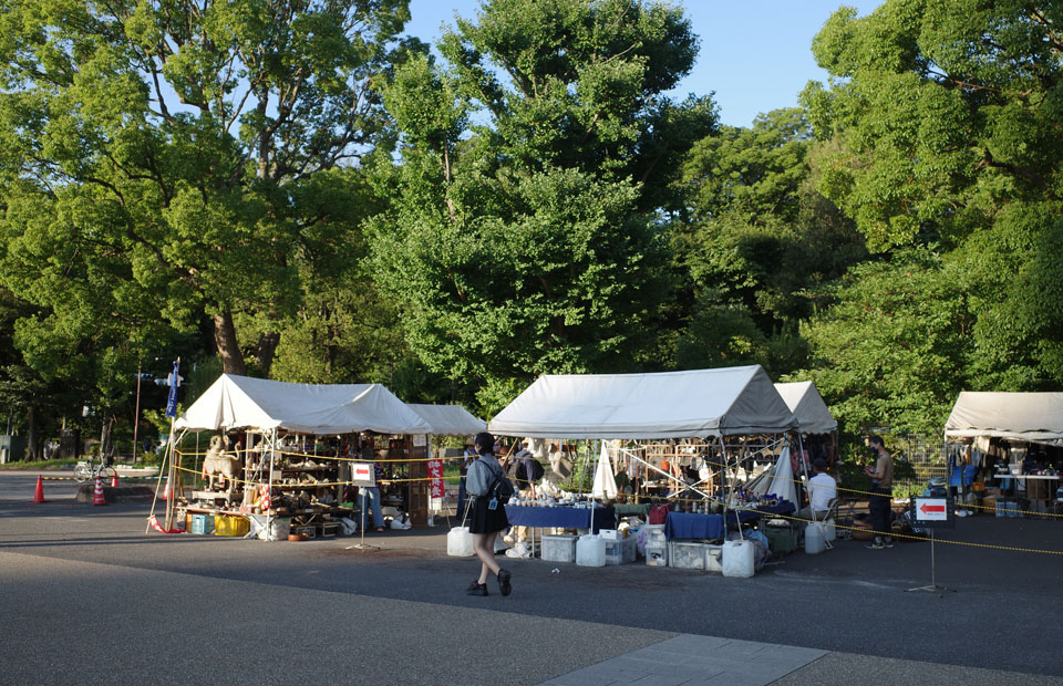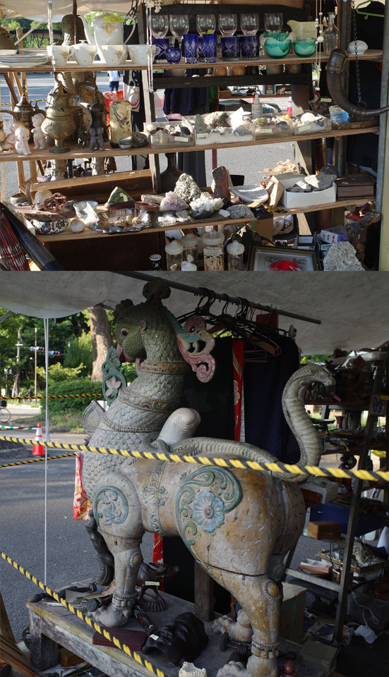 知人の古物商にして造形作家のマンタムさん、この暑いのに上野公園の池のそばで8月1日までの骨董市に出店というので行ってきました7月末。