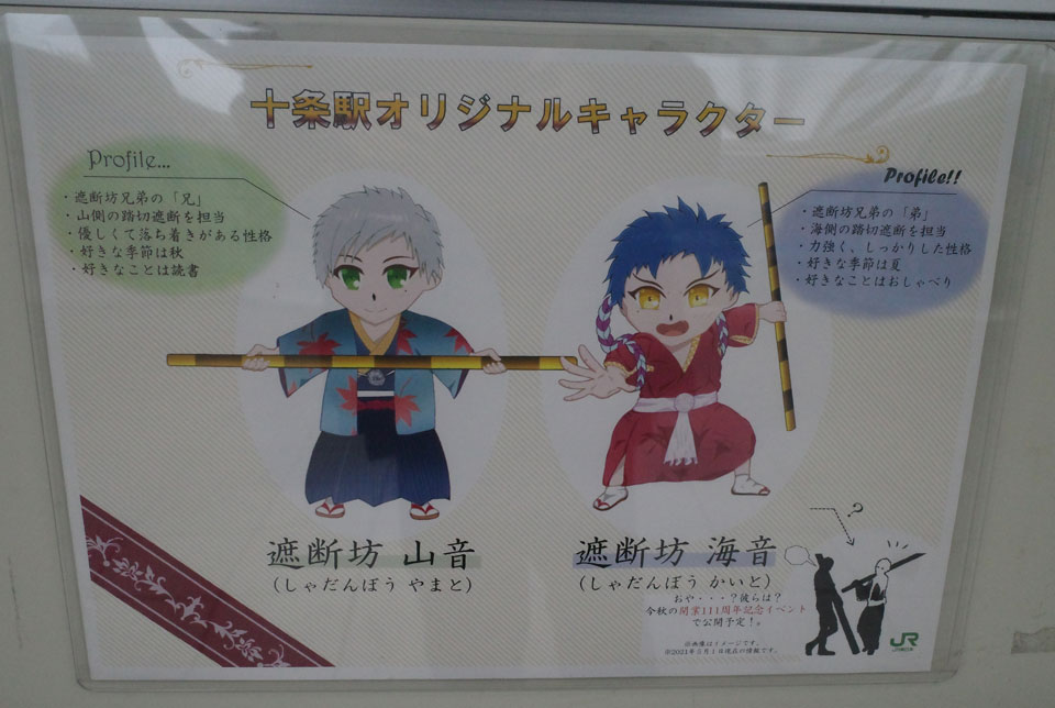 『兄の「遮断坊 山音(しゃだんぼうやまと)」は山側の踏切遮断の担当。優しくて落ち着きがある性格で、好きな季節は秋、好きなことは読書。弟の「遮断坊 海音(しゃだんぼうかいと)」は海側の踏切遮断の担当。力強く、しっかりした性格で、好きな季節は夏、好きなことはおしゃべり』