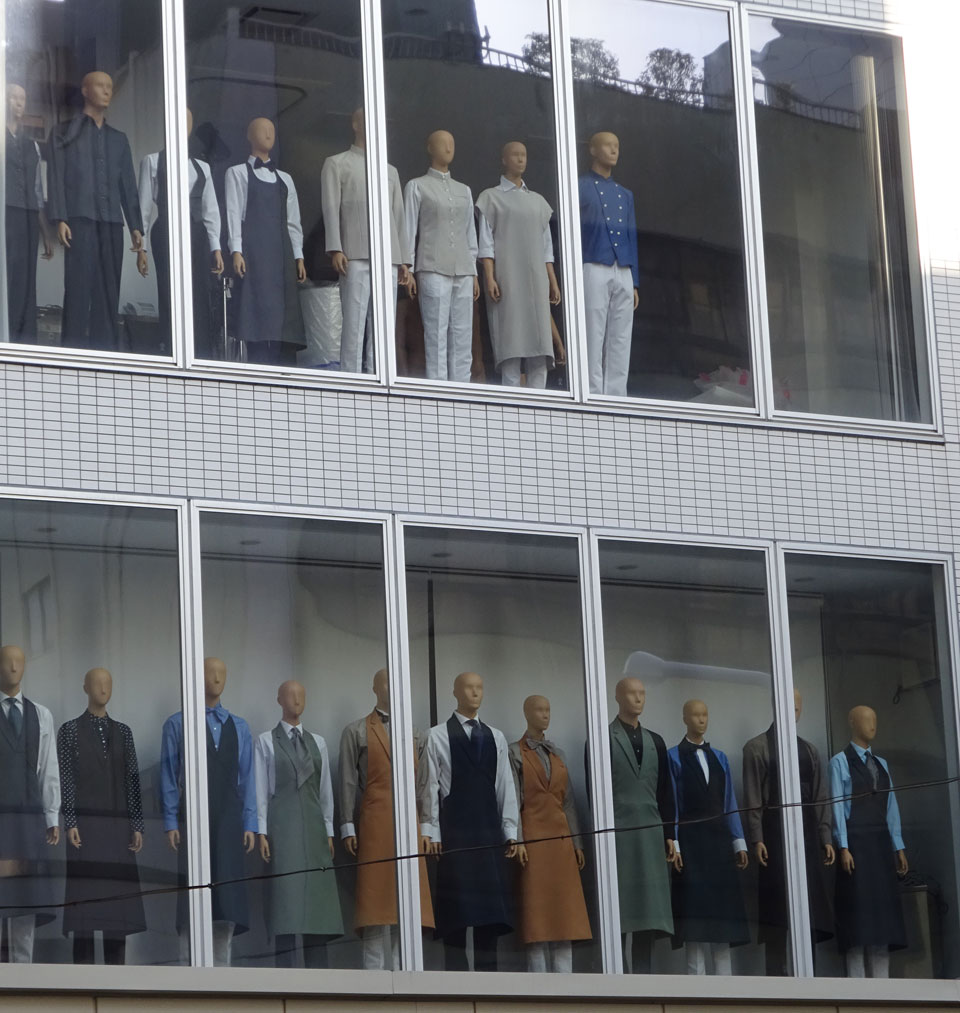 業務用調理道具を多く扱う合羽橋商店街、飲食業系用の制服もたくさんあります。