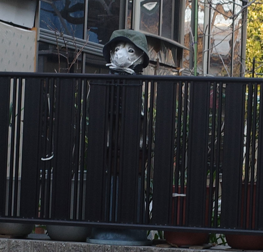 もとは多分ちゃんとした犬の置物なんだろけど、マスクと帽子で遠目には人のようなそうでないようななにかに見えたのでした。まだ明るかったからいいけど暗い時間に見たら怖いと思うぞ。