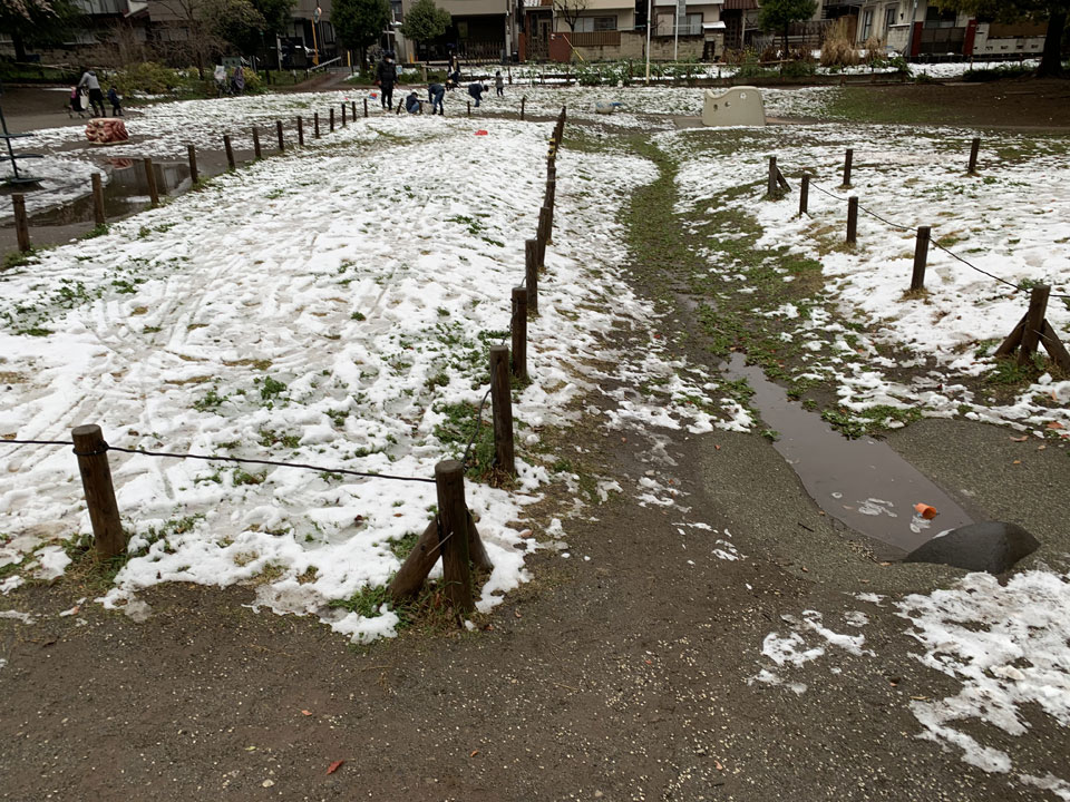 午前中のみとはいえ都心部でも積もるところもあったようで、午後になってもそれほど気温が上がらなかったおかげで少し残ってるところを見ました。