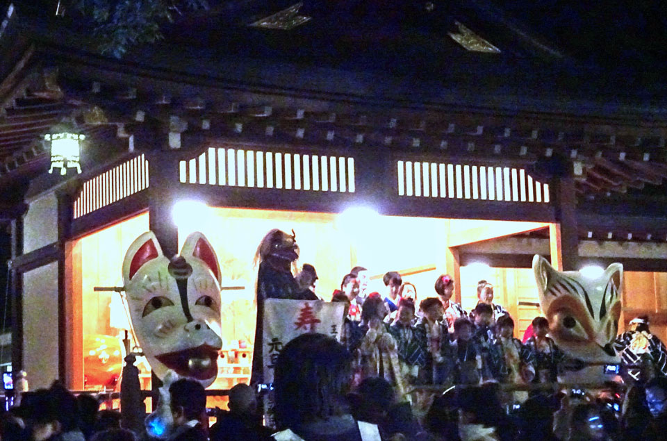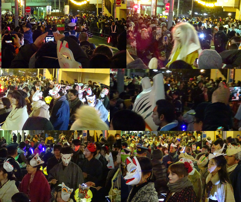 山車を先頭に、あれまあこんなに、という狐面、化粧の行列が。