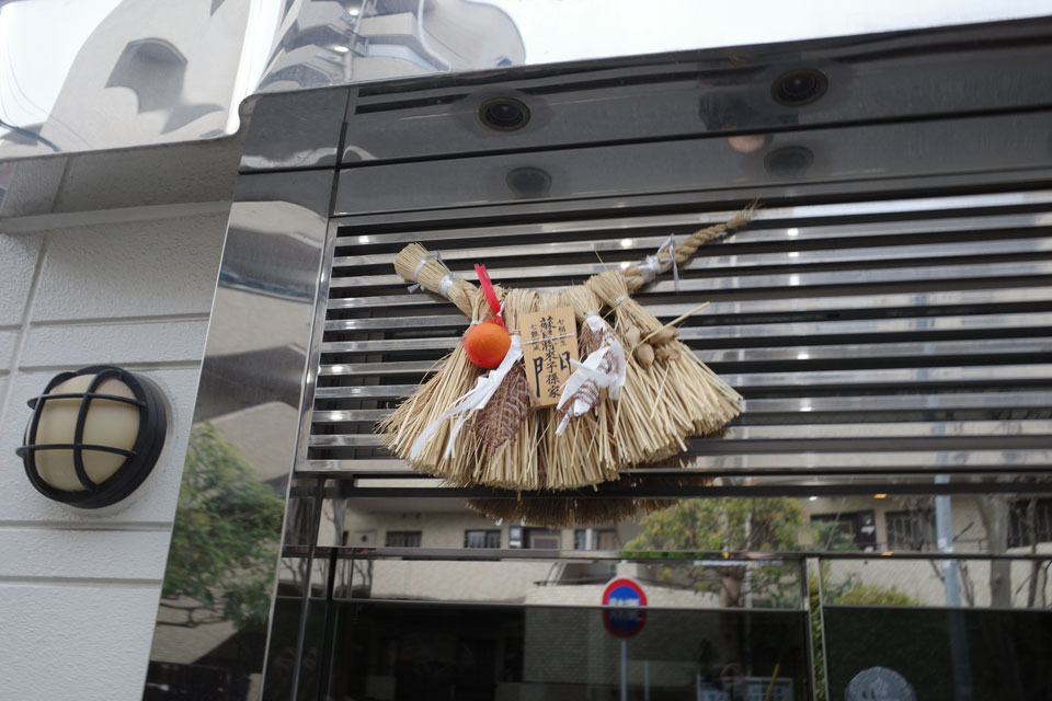ご近所歩き。あまり普段通らないところ行くと、とある家の玄関上にしめ飾りのようなものが。