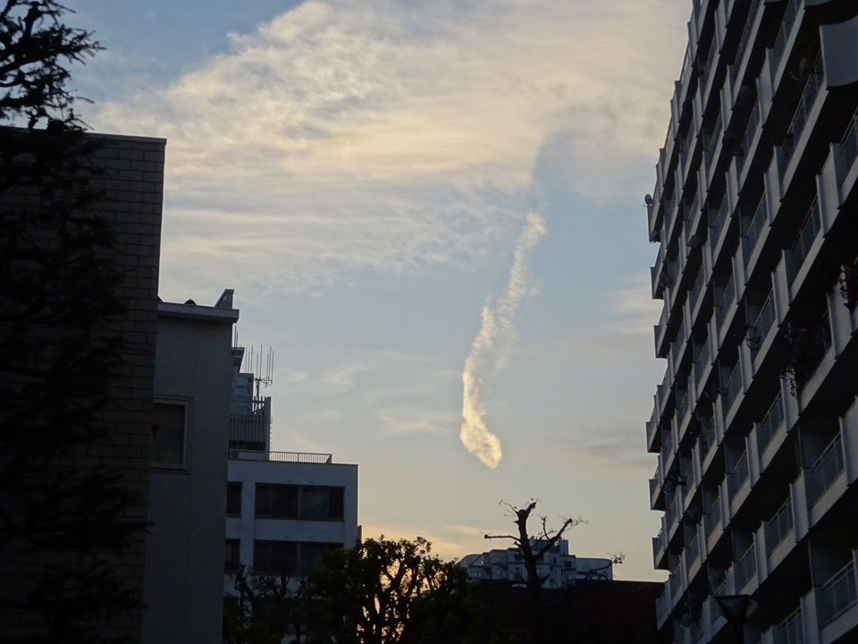 飛行機雲が崩れていい形に見えた夕空でした。