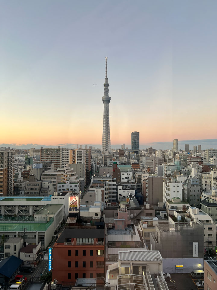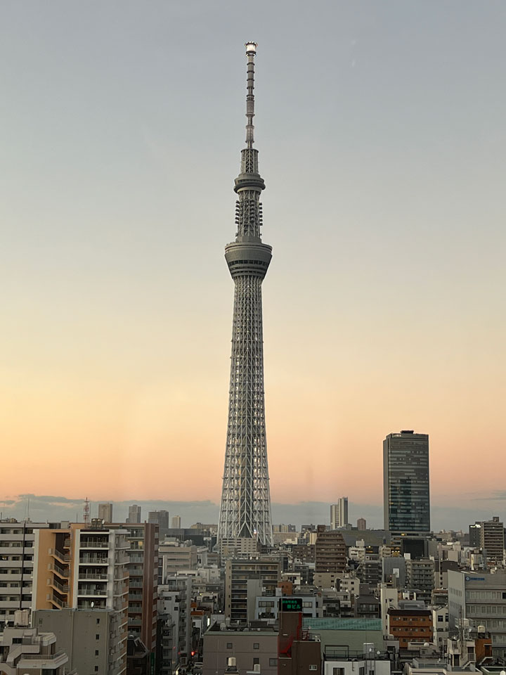 そこからの眺めがこう。このビルが開業したり今の形態になった頃にはここからこんなにスカイツリー見えると思ってなかったのかなあ、こちらにはありがたいですがレストランの窓でないのがもったいないくらい。