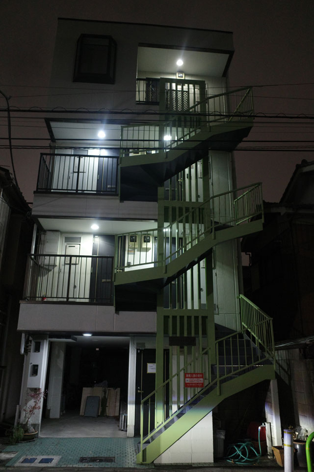 一見なんてことのない3階建て集合住宅ですが、外付け階段が微妙に角度が変化してます。向きが変わるときに高さも合わせてったという工夫の結果なんでしょうかね。