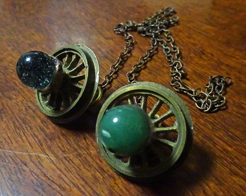 二つの車輪のようなものが合わさった何かをばらして、それぞれに同じくらいの大きさの石をつけて鎖で繋いでみました。手首にまいたり、首輪のようにしたりなど使い方はいろいろかと。不透明な方はウランガラスで、紫外線当たるとぼんやり光るのだそうです。