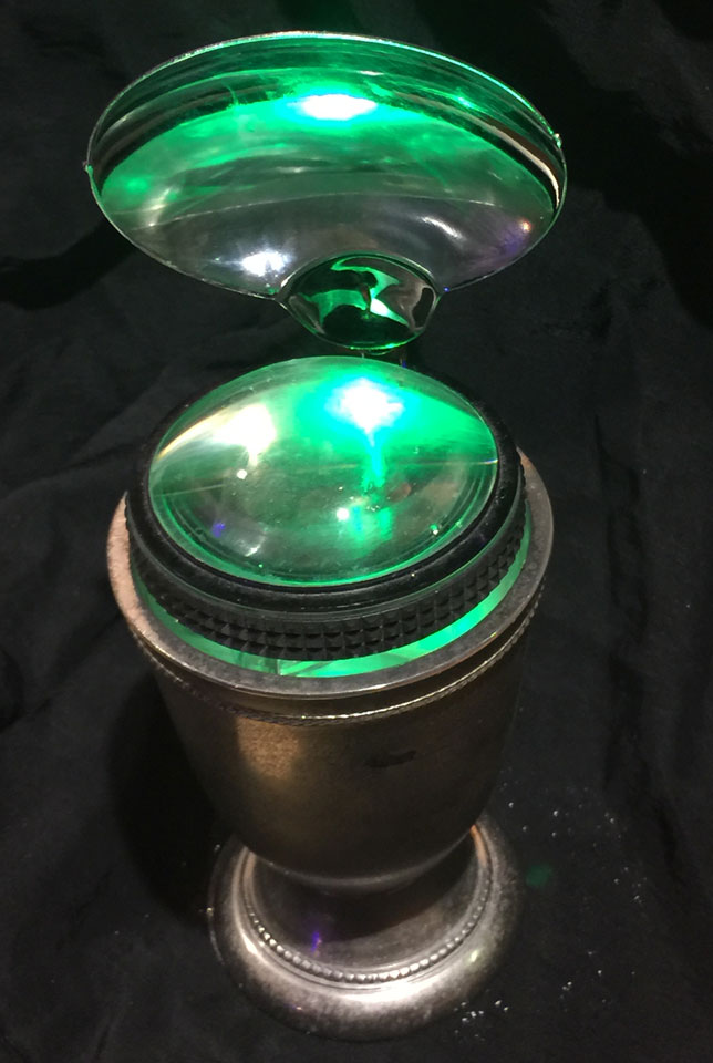 ルーペなどは固定してなくて中の入れ替え自由とたので工程としてはカップに凹面鏡を取り付けただけで簡単にすみましたが、なかなかきれいに光っていいんではないかと。