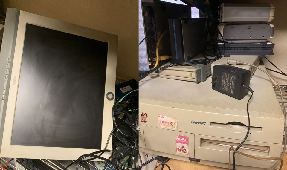 14インチかな?のモニタ、これはまだ動きそう。このモニタにパソコンからとビデオからの入力を切り替えて見たりしてたアダプタ類がいくつも。こっちは使わないかなあ、もう。Power MacintoshG3DTは97年発売。デジモンアドベンチャーの初期のいくつかのCGはこれでつくったり、テイマーズのあたりまで何かしら作って活躍してたはず。起動を試そうとしたら、キーボードを繋ぐケーブルが見つかりません。ADBポートだっけ?SCSI接続のハードディスクとかも中見られないなあ。
