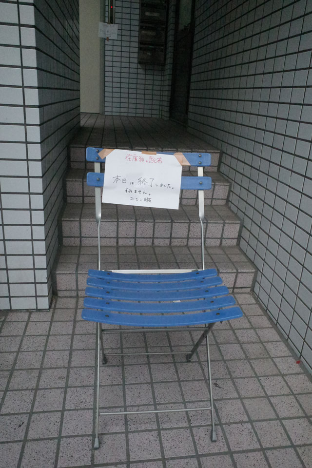 大体の場所は知ってたけどこんなとこだったのかあ。道が真っ直ぐでなくて迷いやすいあたり。あまり店もないんですよ。そこへ向かう人も数人、どうやら配布目当てっぽい感じが。