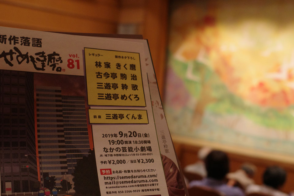 落語家の林家きく麿さん。高校の後輩に当たるということで飲み会ご一緒したことはあるんですが、なかなか高座を拝見する機会がなく。9月半ば10日間連続、新宿末広亭でトリを務められるというのでこれはいい機会かなと思ってたら、その最終日には中野での新作落語会にもでるという。なんだかよくわからないけど、ちょうどその日に中野に行く用ができてたので、これはいいかなと行ってきました。