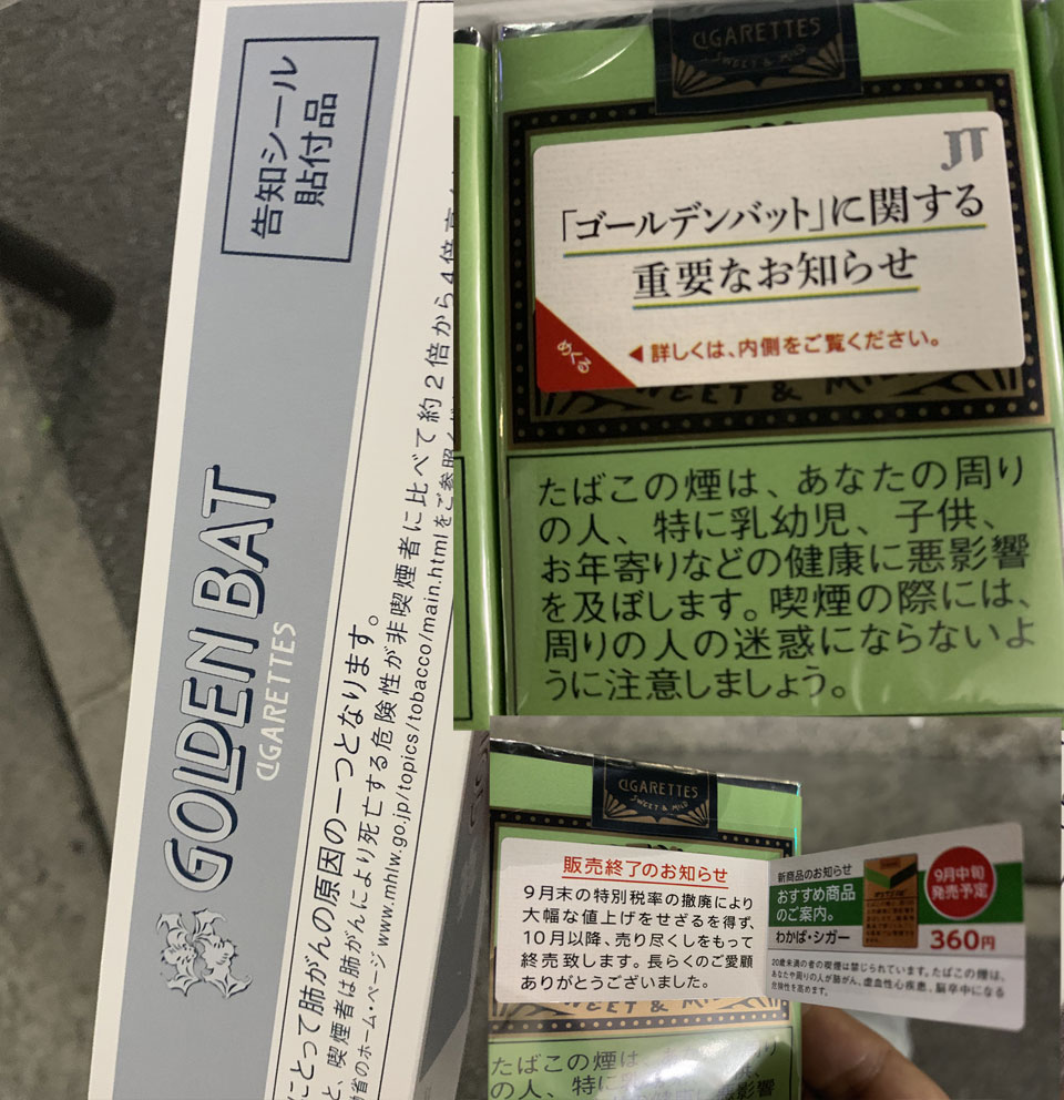 長く愛用してた煙草、ゴールデンバット。いつも10個入りのカートンで買ってて、それも同じ緑のパッケージだったのですが、ちょっと前の発売分だけ違う色のが。