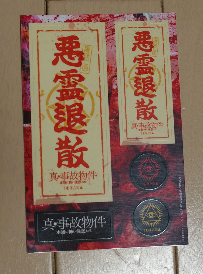 『真・事故物件』の御札シールだけ買ってきまして。なんというかこれ貼るとかえって悪霊呼んじゃうんじゃないかみたいな感じあっていいですねえ。