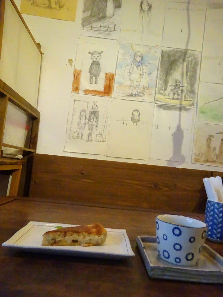 てのひら怪談などでその方面にはおなじみ山下昇平さんのドローイング展開催中。原画が無造作に壁にはられたなかで珈琲とチーズケーキいただきました。ケーキは中にバナナと無花果。美味しゅうございました。コーヒーカップに持ち手がないタイプ。結構好き。