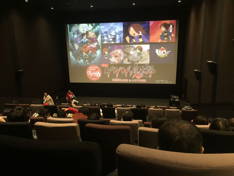 映画館のスクリーンで見る鬼太郎は満足以上のものが。関係者席なので後ろの方なのが残念だけど贅沢はいえません。