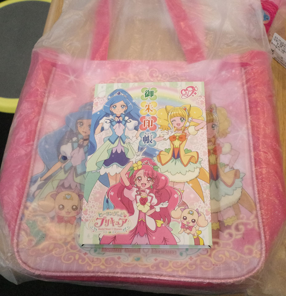 バッグの上に乗ってるのはなんと御朱印帳。プリキュアと御朱印帳という組み合わせは誰が思いついたのか。ちゃんとしっかりした作りで。これ持って神社巡りに。というご時世でもないのが残念です。早くこれが活躍できますように。