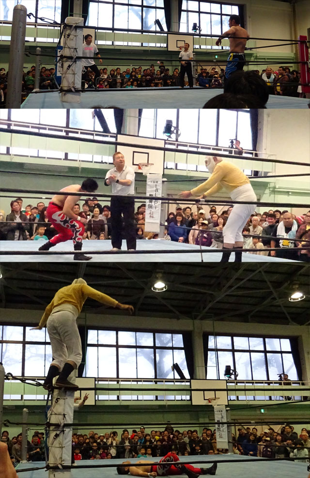 土日の予定が土曜一日だけとなり、おまけに雨でパレードなども中止、区民ホールでの演奏などとなってたようですがメイン会場の体育館ではちゃんと行われました板橋プロレス。