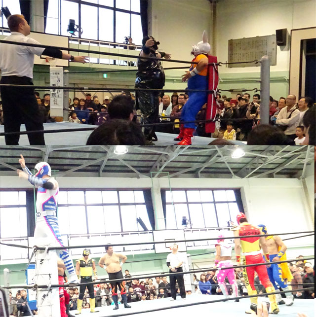 セミファイナルは兎さんと豚さんの対決。兎さんはちかくの不動通り商店街のキャラなんですよ。