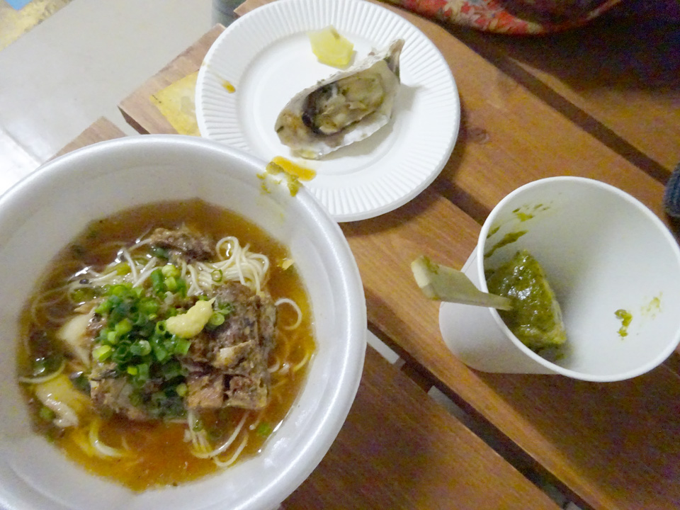 かわりに、そこで作ってた焼き牡蠣、筍の山椒味噌味、じんだ煮いりにゅうめんをいただきました。