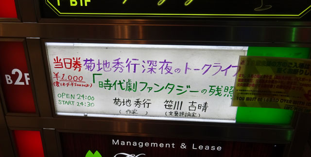 菊地さんも評論家・笹川吉春さんも八犬伝原作ちゃんと読んだことは無いそうで、そういや自分も子供向けリライトか山田風太郎版でよんだくらいかなあ、それでも大体の筋はわかってるからいいか山田風太郎も八犬士揃ったあたりから原作は退屈になってるとか書いてたし。笹川さんは『指輪物語』も旅立つあたりで挫折したまんまとかいうことでしたが