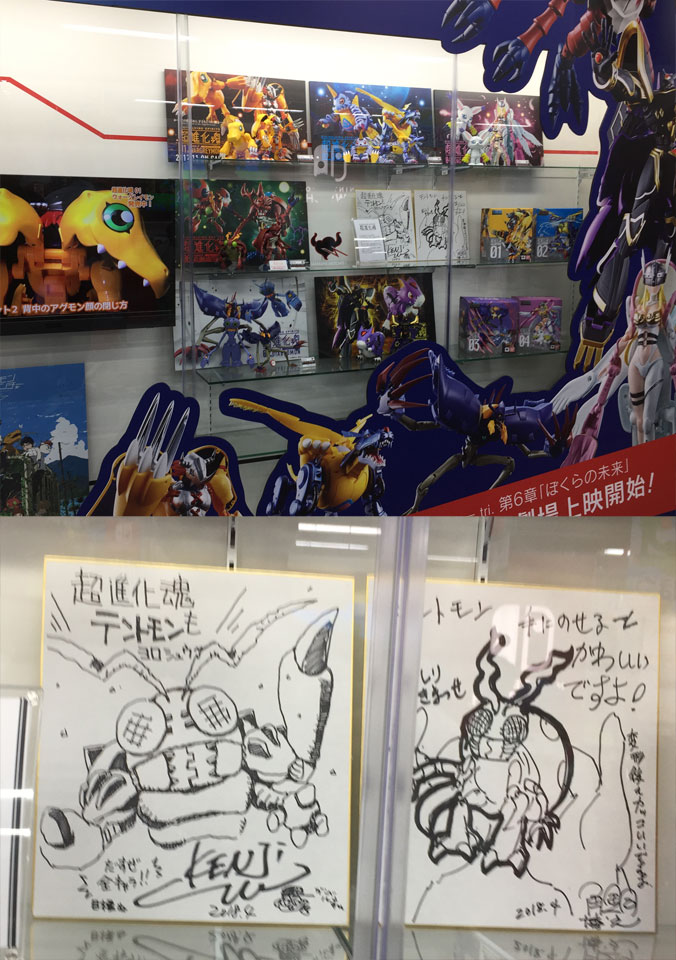 中に飾られてる色紙二枚、デジモンのデザイナーである渡辺けんじさんのと、自分のもの。