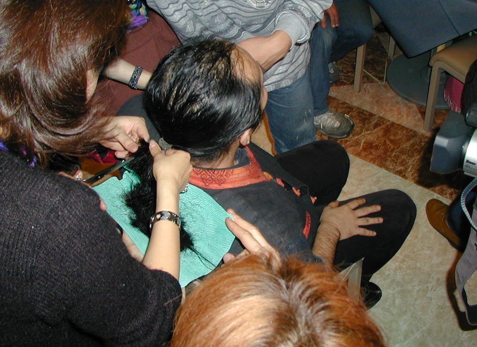 自分の断髪式。最初に藤田淑子さんにはさみ入れてもらったら思い切り切られました。