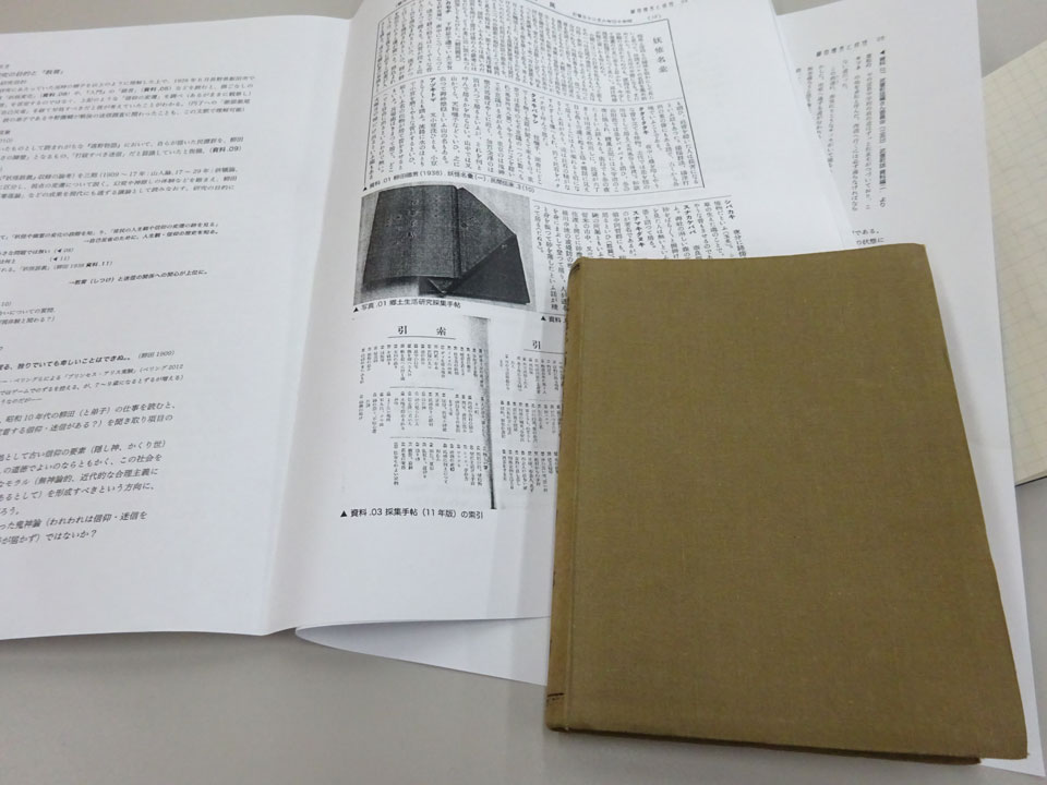 レジュメも充実。さらに柳田國男が各地方に弟子を向かわせるときに持たせた手帳も回覧。これが予め行き先での質問が100項目印刷されてて、持った聞き手によりそれだけでも重要な資料になるというもの。年代により質問事項に変化あるところもまた研究対象となってますが、柳田とか民俗学とは畑違いの川久保さんによるコメントも興味深いものでした。