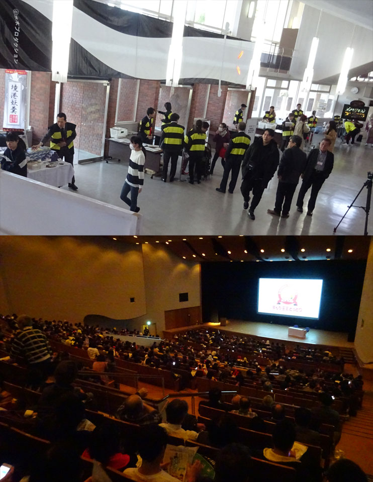 会場の職員さんたちもちゃんちゃんこ着用。コスプレで来られるお客さんには記念品も渡されるということで、会場内には何人もの鬼太郎が。と、よく見ると目玉おやじイケメン人間型とかも。ねこ娘も人気、塗り壁だけでも何体も。悪魔くんやメフィスト、テレビくんまでいました。