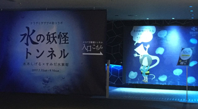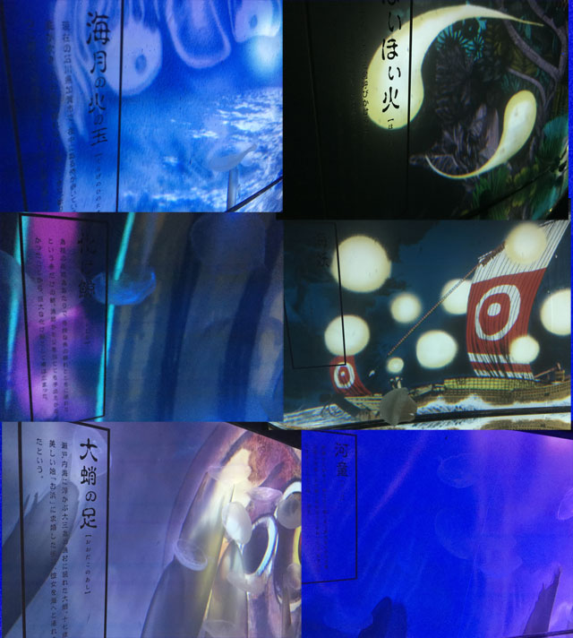もとからあるクラゲトンネルの水槽一つ一つに妖怪の映像が投影され、クラゲがその前を漂うとゆらめく影が映り込むというなるほどこれは面白いもの。