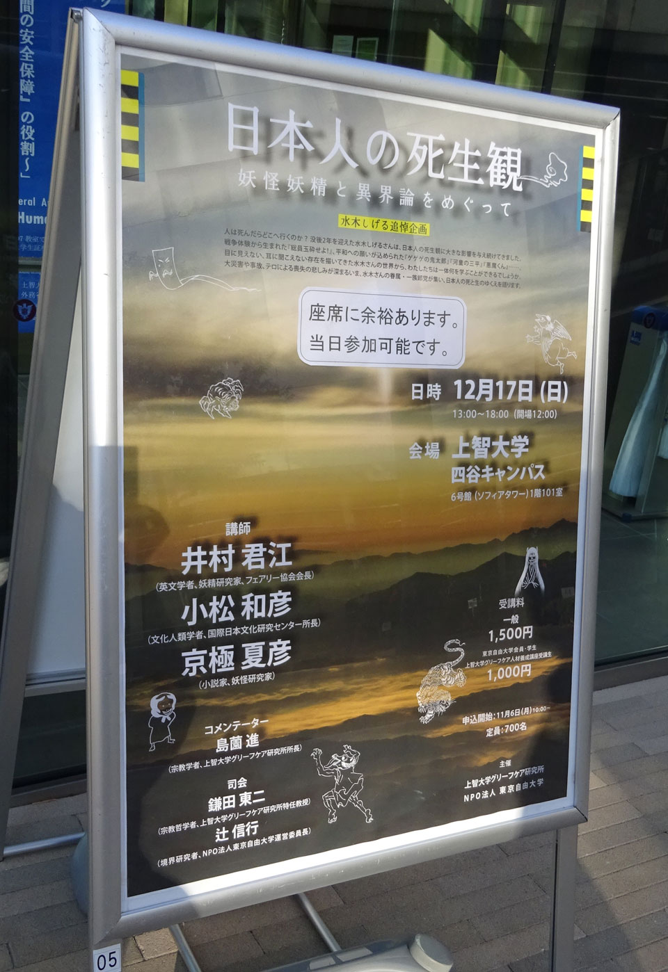 井村さんの妖精、ヨーロッパ、小松さんの柳田、折口、日本人、学問にとらわれない京極さんとそれぞれの立場からの発言と、企画の題にもある水木しげるとの関わりが面白うございました。