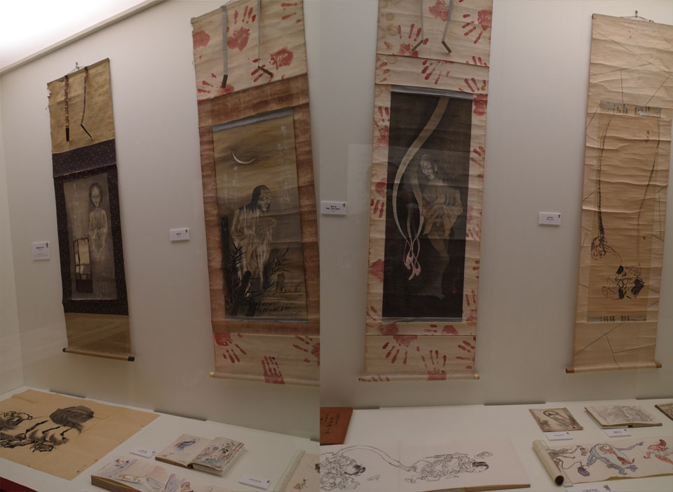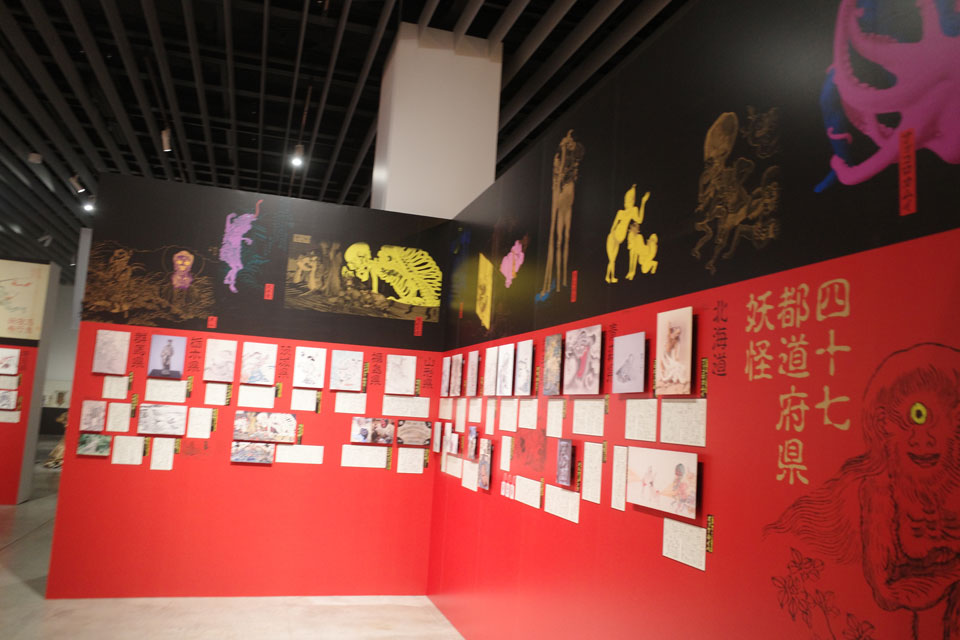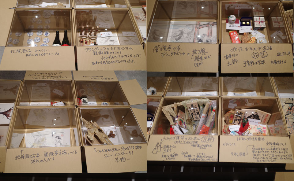 京極夏彦『百鬼夜行』シリーズ文庫版の表紙を飾る荒井良・作の張子細工の妖怪たち。その実物が一斉に展示。これは実物見る機会少ないですから、ファンの方は必見でしょう。