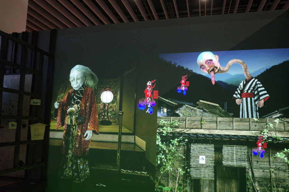 床にも常に何かしらの妖怪が投射。別の壁には刊行された書影がずらりなど、この部屋だけでも何時間も過ごせそうな。