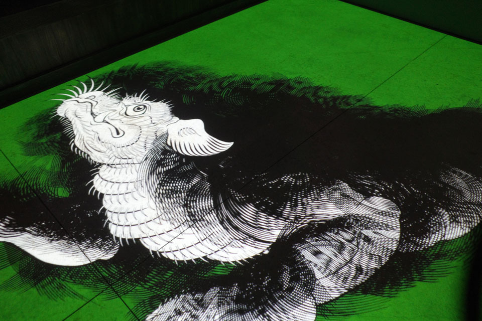 別の壁には京極書斎PCで稼働してる自作のスクリーンセーバー映像が投射。妖怪が170種以上もいるんだそうで、一回り見るのに30分かかるそうですよ。