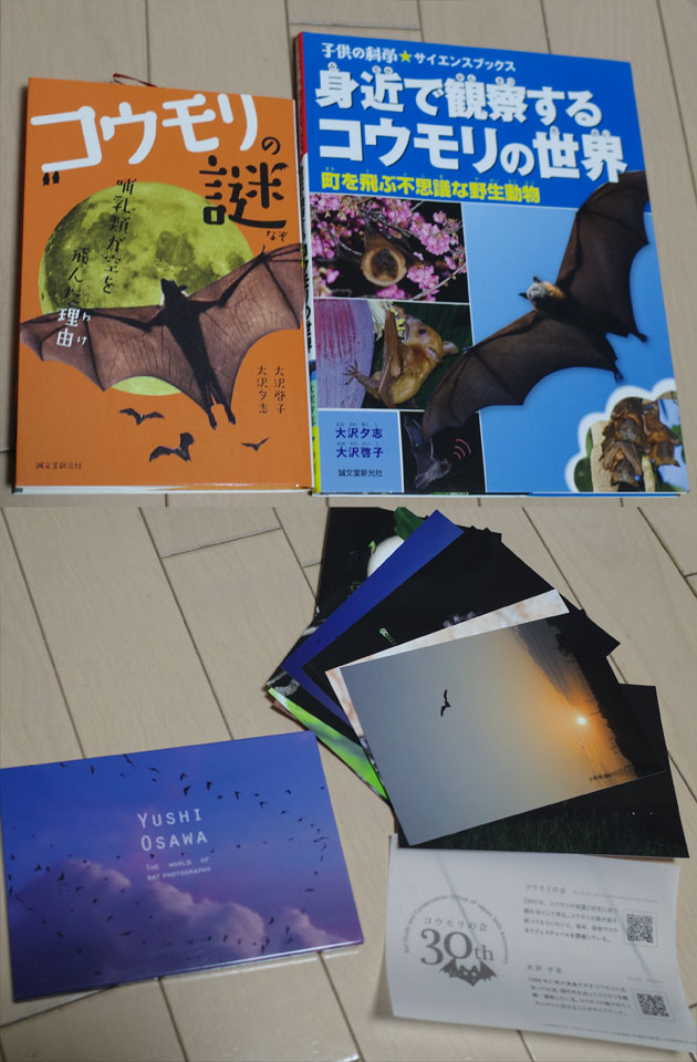 大沢さんの著書とポストカードセット買ってきました。蝙蝠のこと知らないことばかり。か^土はこの美麗な写真を12枚組で500円は安すぎですよ。