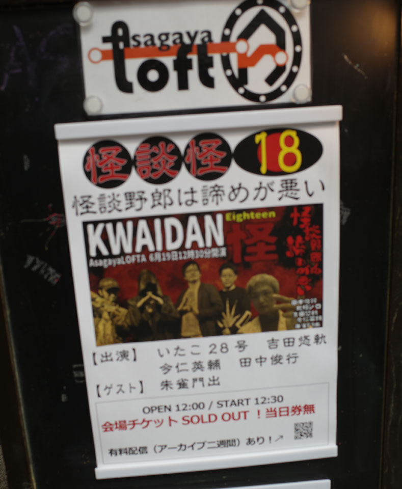 しばらくぶりの阿佐ヶ谷ロフトでの怪談イベント。いつものいたこ28号 吉田悠軌 今仁英輔 田中俊行に関西から特別ゲスト朱雀門出、という布陣。