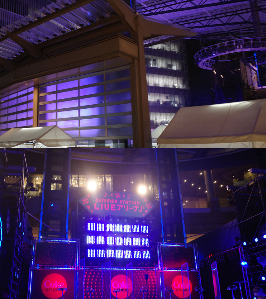 ヒルズのアリーナ、昼間はいろんな人たちが音楽してるようなのですが、夜には怪談やってたのです。日替わりで出演者がかわり、計8回公演、かな。とはいえ音はアリーナの囲いのそとにもれても姿が見えなければ問題ない音楽ライブとと違って語りがメインの怪談は外に聞こえてはいけないのでこんなものを。