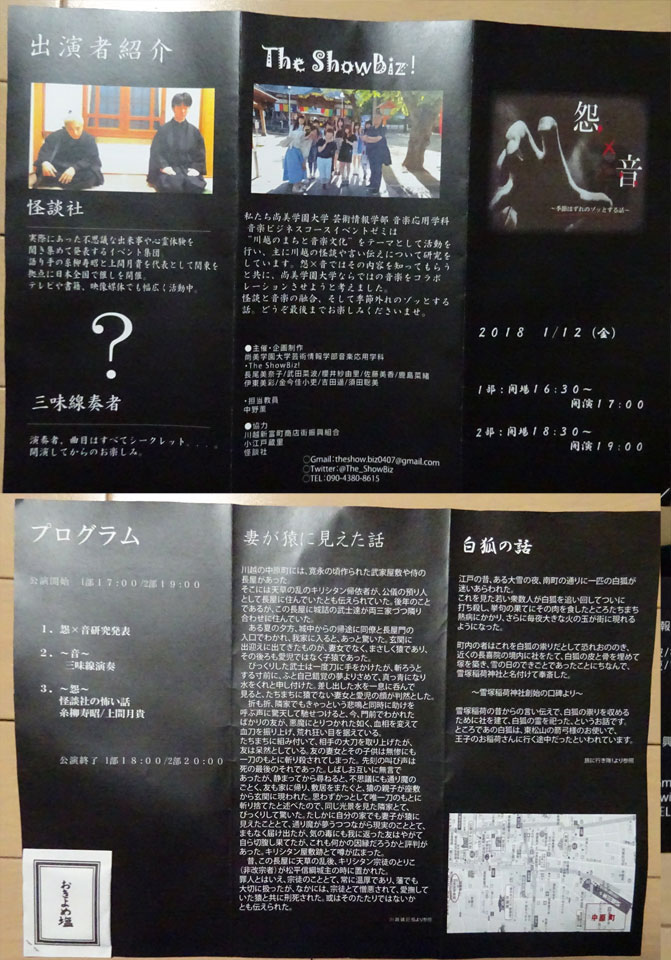怪談社の公演ですが今回は尚美学園大学芸術情報学部音楽応用学科ビジネスコースイベントセミなるところの主催。