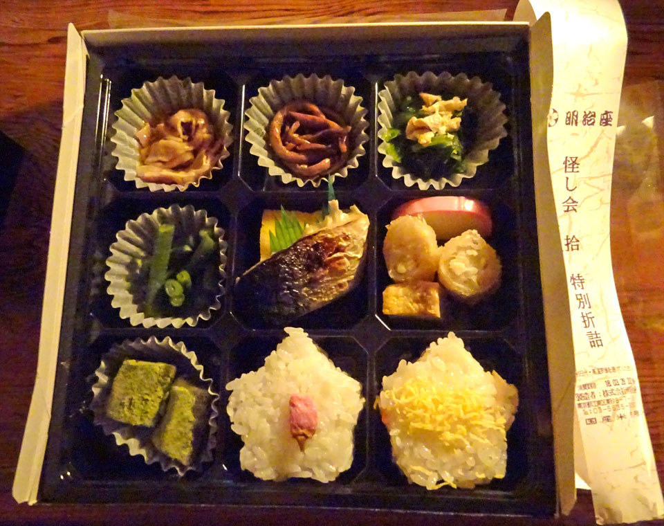 お寺で怪談会ができて、合間に美味しいお酒とおつまみメインのお弁当というのがこの会の特色。今回も美味しゅうございました。