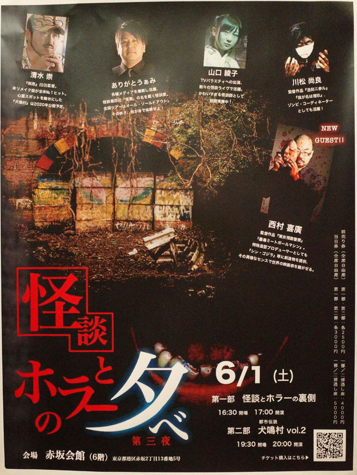もう三回目の『呪怨』清水崇監督『我が名は理玖』川松尚良監督に怪談師ありがとうぁみ、山口綾子お二人によるトークイベント。今回はゲストにホラー映画監督であり特殊造形プロデューサーの西村喜廣さん。