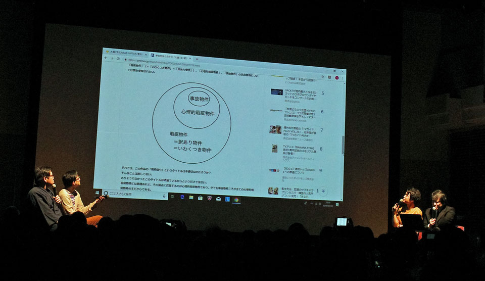 とりあえず、吉田、田所で怪談ひとつずつ語ったあと大島てる加えてこのカルチャートークの人と4人で事故物件話。瑕疵物件ともいうけど、物損など支障がある、とか窓開けると墓地とか、同階に暴力団住んでるとかも瑕疵なんだそうですよ。思わず聞きながら今時分が住んでるとことか実家とか職場の近辺大島てるサイトで検索してしまいました。住んでるあたりには特に何もなかったけど。