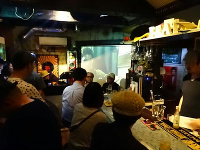 伝奇やホラー作家の朝松健さんと、『超・怖い話』シリーズ序盤の共著者であった樋口明雄さんという珍しい組み合わせによる怪談トーク。デジカメ待ってたのでギリギリの時刻に入ると、あまり広くない店内は満員で。
