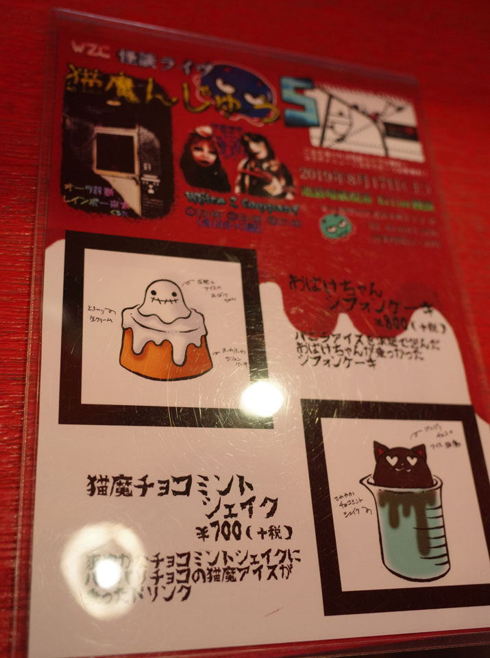 中は10人位で満席かな。そのうち二人は今回怪談語る猫魔王と猫魔の白塗りメタルポップユニットWhite Z Companyのお二人。午後からだいたい二時間おきに二話ずつ語ってきたとのことでその最後の二話を聞いてきました。