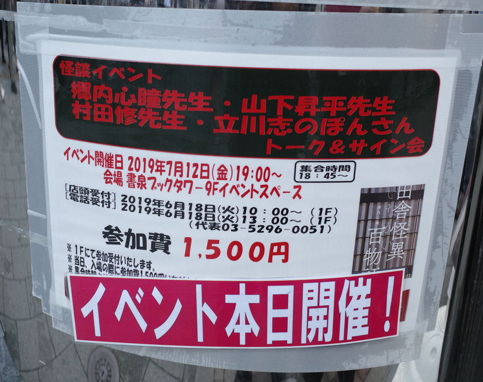 そのころ西浦和也さんは新宿の中山市朗ダークナイトに行ってて、そっちも盛り上がってたようです。これから夏、怪談イベントがぶつかるの多くなるんだろかなあ。