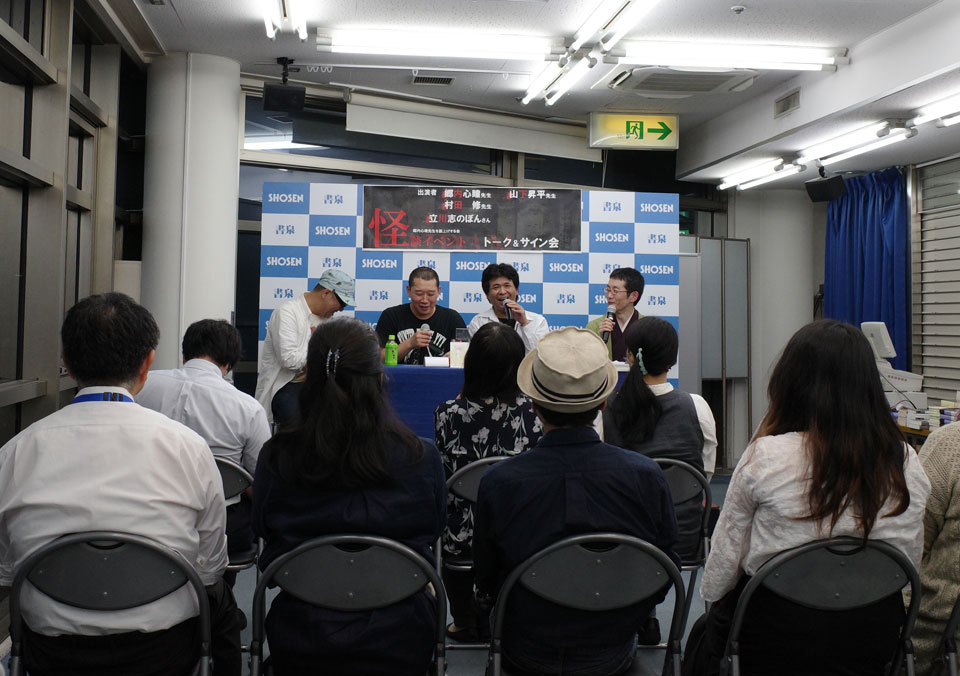 郷内さんは最近ドラマ「拝み屋怪談Ⅱ」も放映開始された拝み屋兼怪談作家、山下さん、村田さんはそれぞれ装画担当されたイラストレーターさん、立川志のぽんさんはええとどなたかの同級生だっけか。