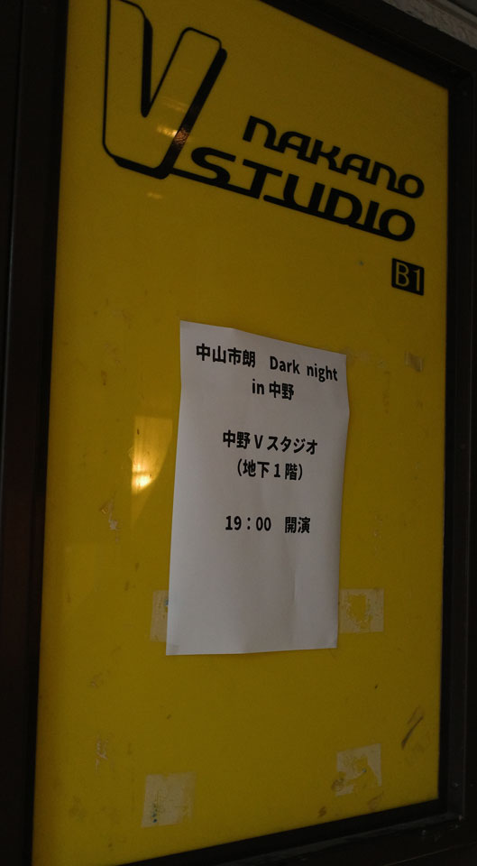 おなじみ中山市朗さんの怪談、すっかり定例化した東京公演。いつも夜の部は池袋なんですが、会場が取れなかったとかではじめての中野。それも南口から真っ直ぐ南下というあまり行かない地域。50人だとぎっしりかなあ。
